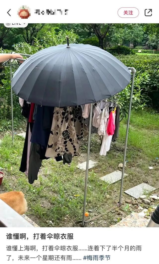 有网友已经开始打着伞晾衣服了,还有网友很无奈,称晾了一周的衣服终于馊了......