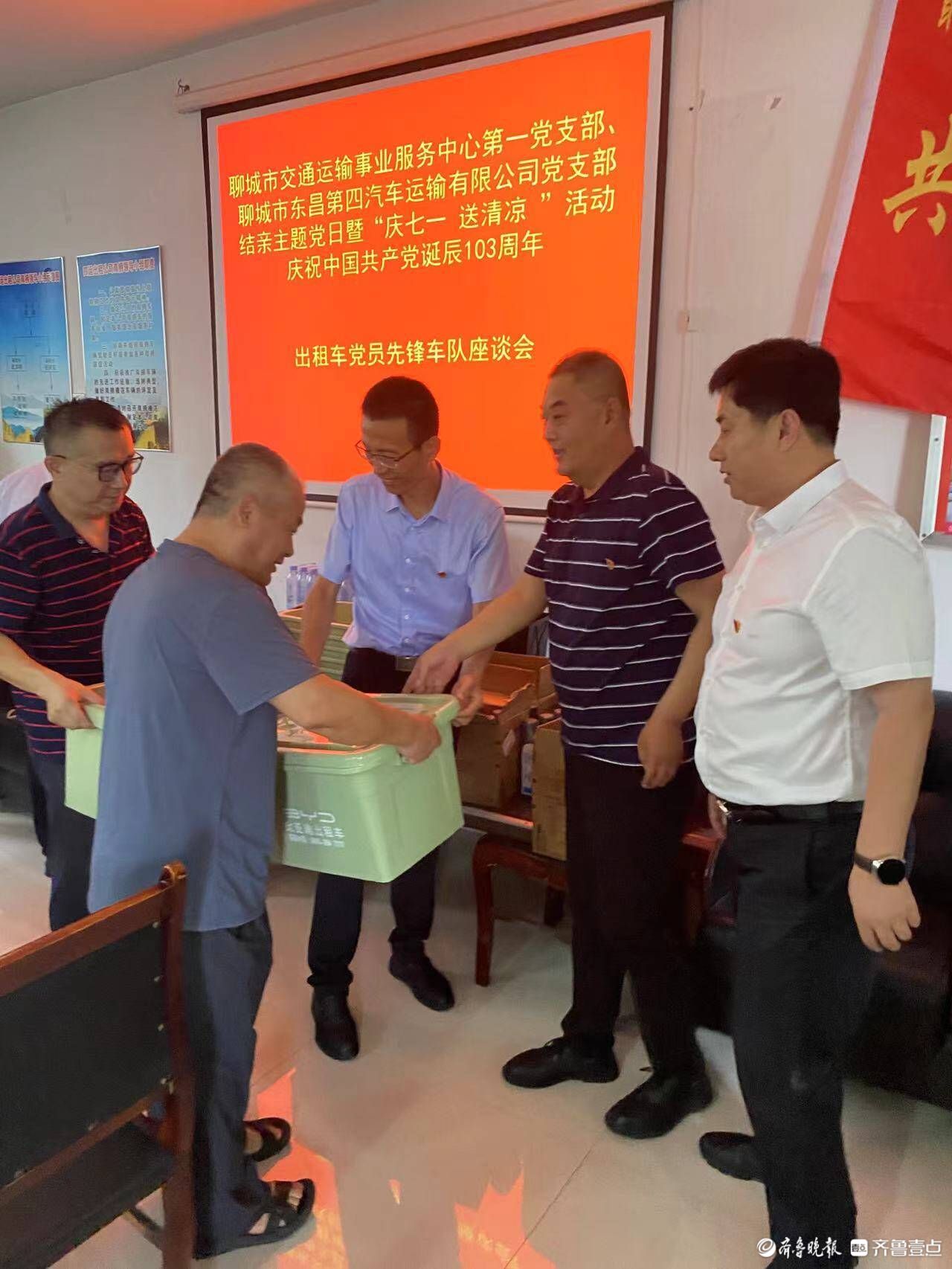 7月1日,聊城市交通运输事业服务中心第一党支部、聊城市东昌第四汽车运输有限公司党支部结亲开展主题党日暨“庆七一 送清凉 ”庆祝中国共产党诞辰103周年出租车党员先锋车队座谈会。
