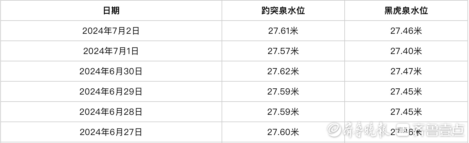 济南市城乡水务局官网显示,7月2日,趵突泉水位为27.61米,黑虎泉水位为27.46米,分别较上一日上涨4厘米、6厘米。趵突泉水位也在本轮降水的帮助下重回27.60米红色警戒线之上。