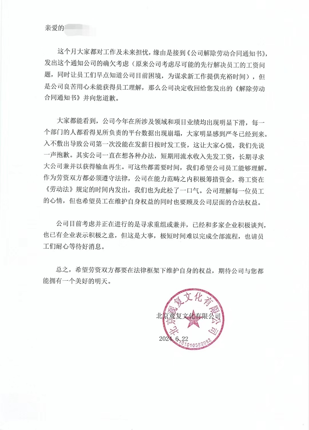 张先生介绍,6月22日,公司收回了部分解除劳动合同通知。他提供的一份北京观复的说明显示:“这个月大家都对工作及未来担忧,缘由是接到《公司解除劳动合同通知书》,发出这个通知公司的确欠考虑(原来公司考虑尽可能先行解决员工的工资问题,同时让员工们早点知道公司目前困境,为谋求新工作提供充裕时间),但是公司良苦用心未能获得员工理解,那么公司决定收回给您发出的《解除劳动合同通知书》并向您道歉。”该通知还提到:公司今年在所涉及领域和项目业绩均出现明显下滑,公司目前考虑并正在进行的是寻求重组或兼并。通知落款时间为2024年6月22日。