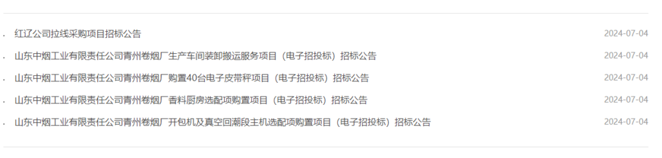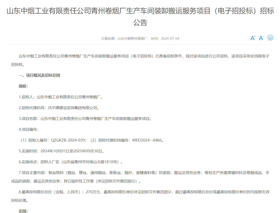 近日,记者从国家烟草官网看到,山东中烟工业有限责任公司青州卷烟厂于7月4日发布4条招标公告。
