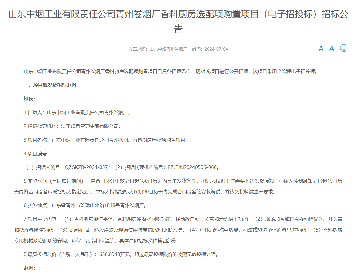 山东中烟工业有限责任公司青州卷烟厂香料厨房选配项购置项目(电子招投标)招标公告,项目主要内容:(1)香料厨房操作平台,香料厨房冷凝水回收功能,移动罐自动开关盖和清洗烘干功能;(2)现场加香加料点移动罐输送、开关盖和糖香料搅拌功能;(3)原料抽吸、料液灌装及现场使用防差错比对RFID系统;(4)单体原料称重功能,桶装或袋装单体原料吊装功能;(5)香料厨房专用机械及增配项的安调、运保、吊装和保温等。最高投标限价(含税、人民币):658.8948万元。