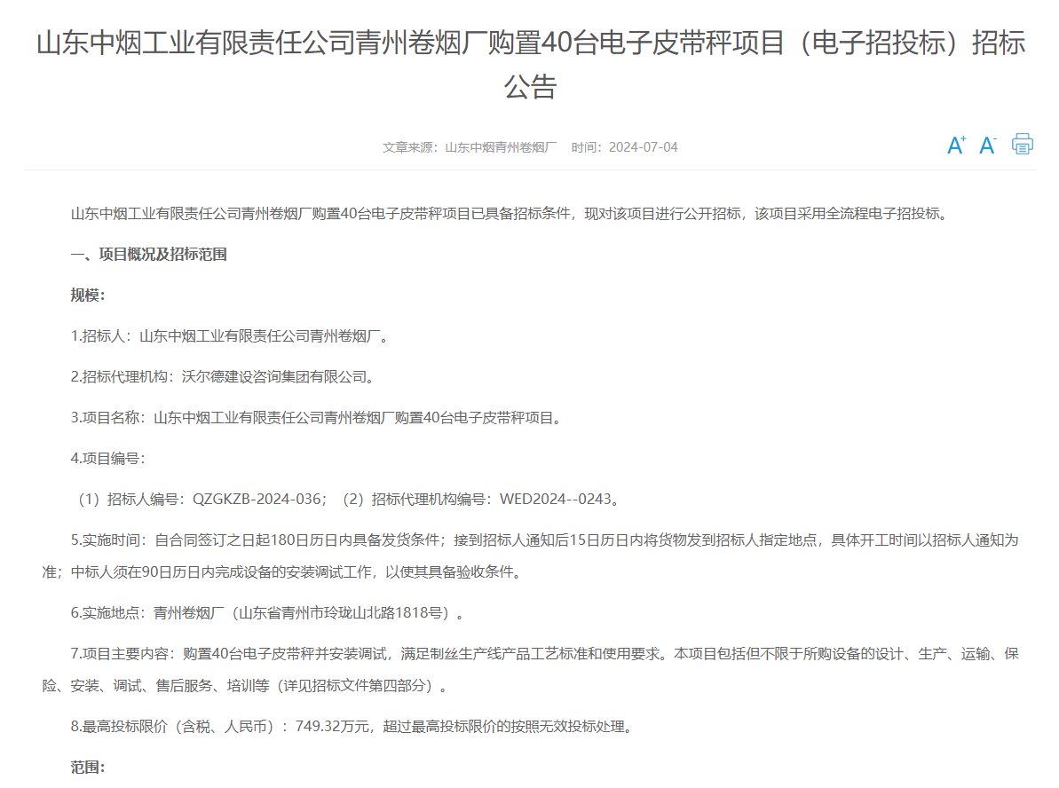山东中烟工业有限责任公司青州卷烟厂购置40台电子皮带秤项目(电子招投标)招标公告,项目主要内容:购置40台电子皮带秤并安装调试,满足制丝生产线产品工艺标准和使用要求。本项目包括但不限于所购设备的设计、生产、运输、保险、安装、调试、售后服务、培训等。最高投标限价(含税、人民币):749.32万元。