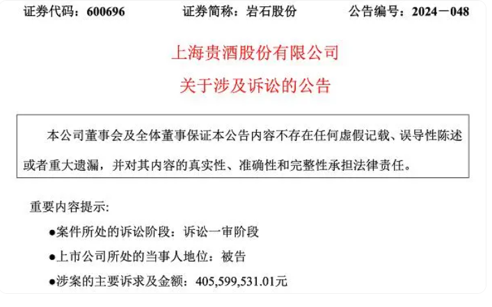 因子公司贵州高酱未依约支付工程款,上海贵酒作为第二被告被中建四局诉请支付工程欠款、停工损失及逾期利息逾4亿元。