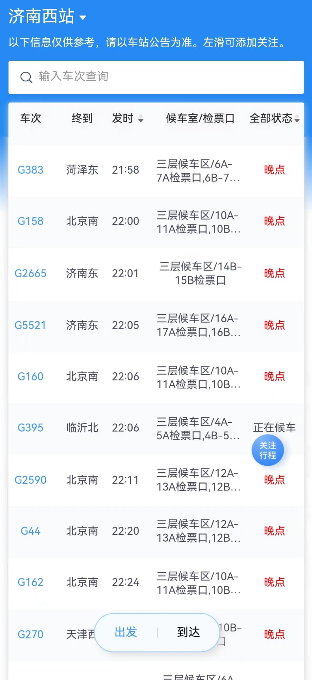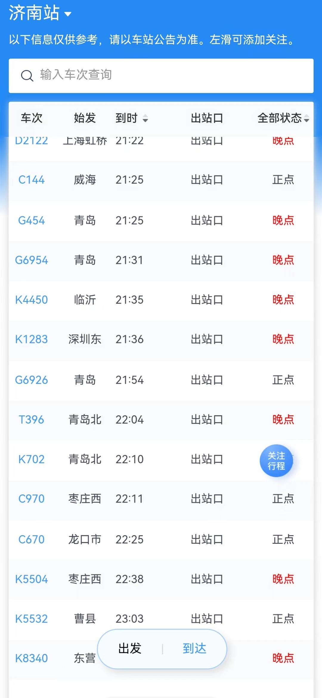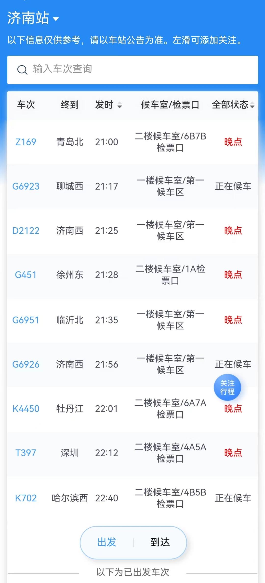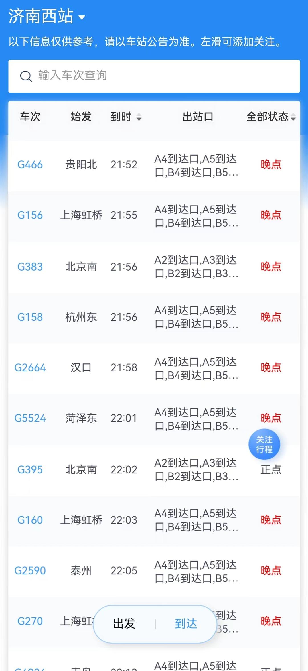 5日晚8点50分,记者查询12306发现,目前济南站、济南西站等车站的出发、到达多个车次出现晚点,旅客可通过12306提前查询列车相关信息,妥善安排出行规划,确保出行安全。