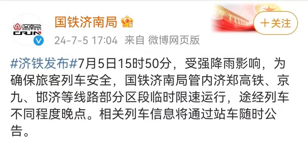 7月5日15时50分,国铁济南局发布微博:受强降雨影响,为确保旅客列车安全,国铁济南局管内济郑高铁、京九、邯济等线路部分区段临时限速运行,途经列车不同程度晚点。相关列车信息将随时公告。