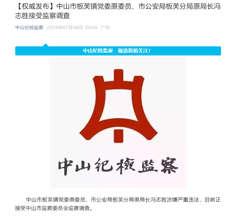 据中山纪检监察7月8日消息,中山市板芙镇党委原委员、市公安局板芙分局原局长冯志胜涉嫌严重违法,目前正接受中山市监察委员会监察调查。