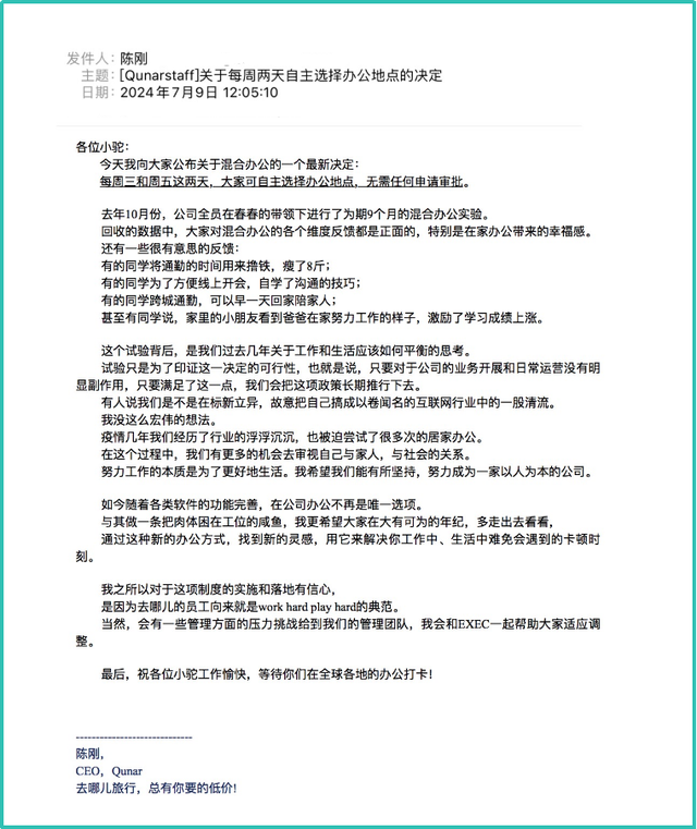 7月9日,去哪儿CEO陈刚发布关于混合办公的全员信