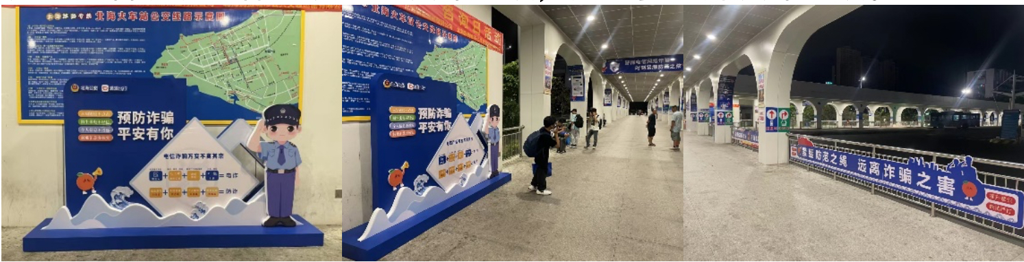 在北海市,滴滴出行联合当地警方在北海火车站建设反诈长廊,以“文字+漫画”的形式向过往行人展示诈骗常见套路、诈骗典型案例、诈骗预防等内容,让过往旅客沉浸式体验、学习反诈知识,进一步提升反诈意识。