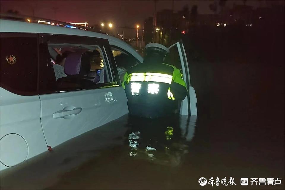 7月8日晚,因强降水导致一正行驶车辆被困道路积水中,危急时刻,郓城交警及时救助,获得三名驾乘人员一致称赞。
