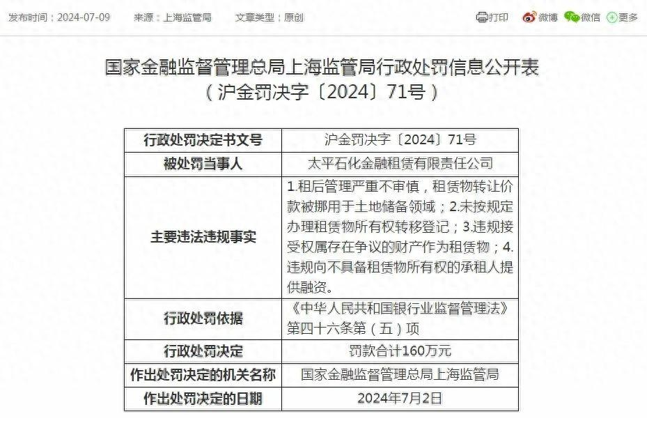 据处罚信息,太平石化金租存在多项违规问题,包括租后管理严重不审慎,租赁物转让价款被挪用于土地储备领域;未按规定办理租赁物所有权转移登记;违规接受权属存在争议的财产作为租赁物;违规向不具备租赁物所有权的承租人提供融资。