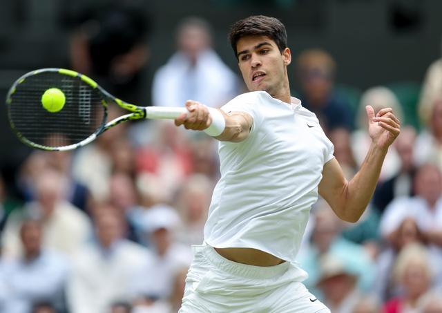 在首场男单半决赛中,卫冕冠军阿尔卡拉斯在先失一盘的情况下,连赢三盘,以6比7(1)、6比3、6比4、6比4击败5号种子梅德韦杰夫,挺进温网决赛。