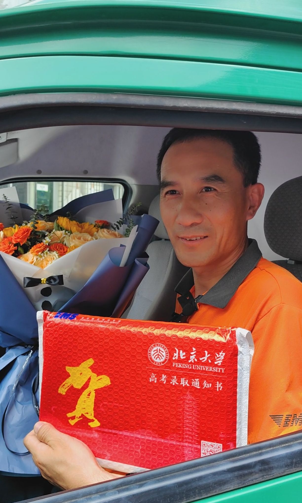 揽投员刘金昌带着今年潍坊首封录取通知书和为考生准备的鲜花,出发前往考生家中。