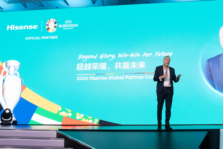 德国柏林时间7月14日,海信2024欧洲杯全球客户大会在德国柏林举行,全球500余位合作伙伴参会。会议上,海信发布了品牌、场景化、产业及全球化四大关键领域全面升级策略。欧足联营销总监盖伊·爱普斯坦(Guy-Laurent Epstein)出席,并高度评价与海信的三次深入合作。“海信的显示产品应用于莱比锡VAR裁判总部,不仅提升了观赛体验,也为裁判决策提供了有力支持。”盖伊·爱普斯坦表示,海信等中国企业以顶尖赛事为媒介,通过跨越国界的合作推动了科技与体育的加速融合。