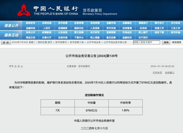 据中国人民银行官网消息,为对冲税期等因素的影响,维护银行体系流动性合理充裕,2024年7月16日中国人民银行以利率招标方式开展了6760亿元逆回购操作。具体情况如下: