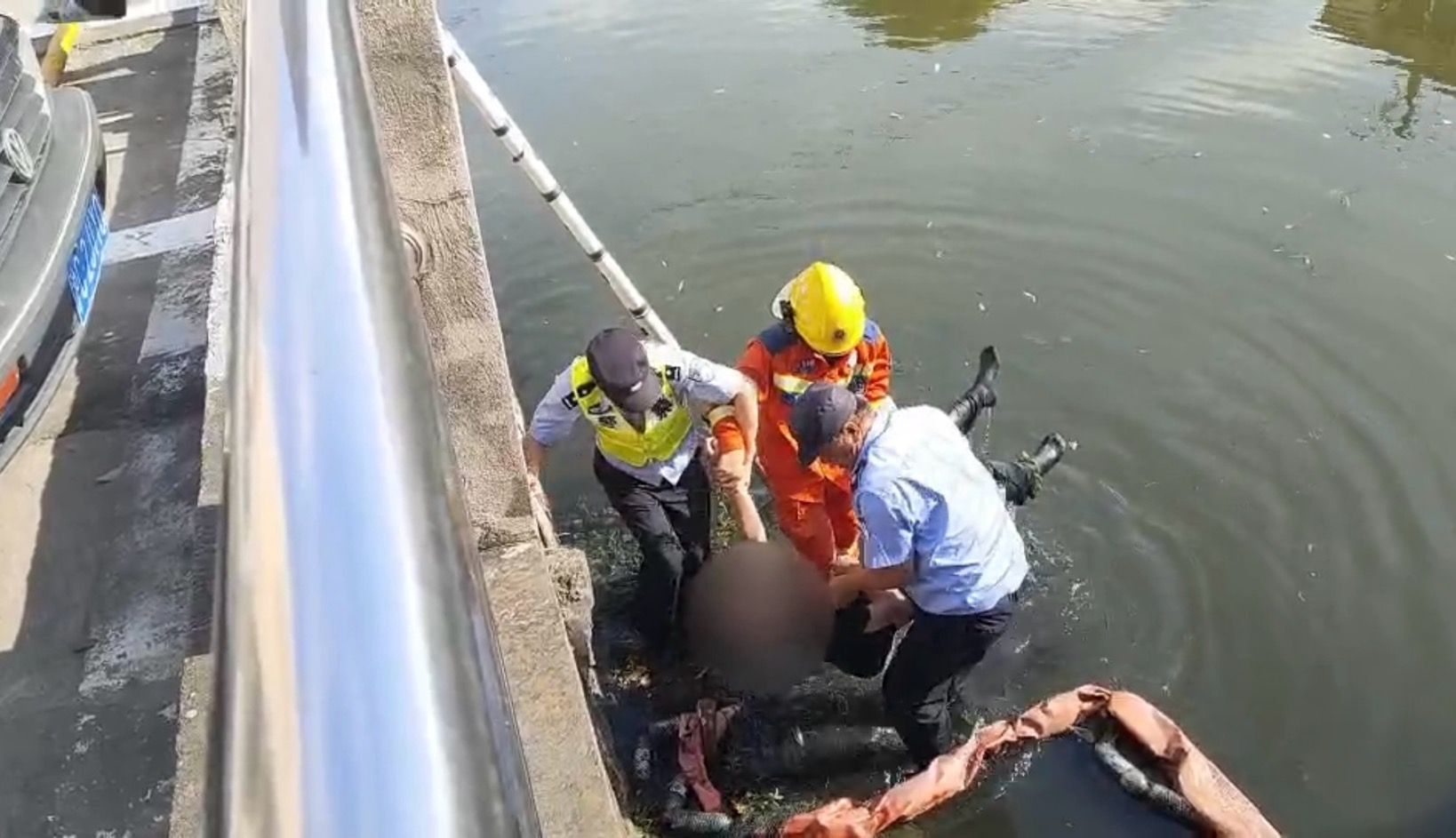 在民警和消防队员的配合下,合力将小夏成功救起。 上海奉贤公安 供图