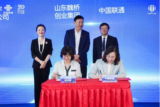7月19日,在2024中国联通合作伙伴大会上,中国联通与山东魏桥创业集团签署全面战略合作协议,这标志着双方将在更高层次、更宽领域、更高水平上开展全面合作。中国联通政企客户事业群副总裁梁鹏、山东魏桥创业集团信息中心马法红主任代表双方签约。