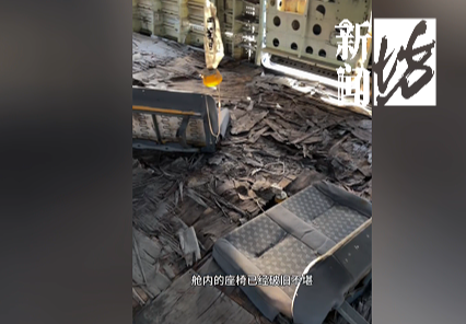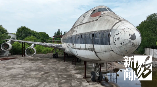 记者根据地址信息,在一处工业园区内找到了这架波音747飞机,飞机外围有一圈铁丝网,整架飞机破旧不堪,发动机和螺旋桨缺失,周身已有多处锈迹,机身文字也被涂抹,尾翼部分散落在地上。