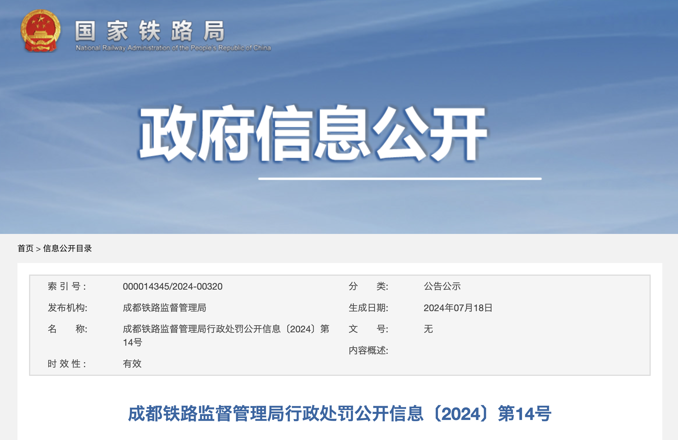 记者于国家铁路局官网获悉,7月18日,成都铁路监督管理局公示了对中铁三局集团第五工程有限公司实施行政处罚的有关情况,文号为成都铁路监督管理局行政处罚公开信息〔2024〕第14号。