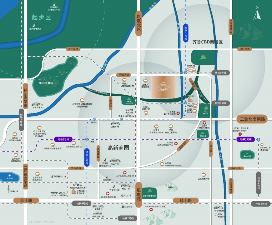 新东站片区是济南东强战略发展热土,片区依托“济南城市次中心、国家级重要交通枢纽、TOD项目实施区域”战略定位,发展前景可期。龙泉府占位新东站核芯位置,未来将与区域发展同频共进。
