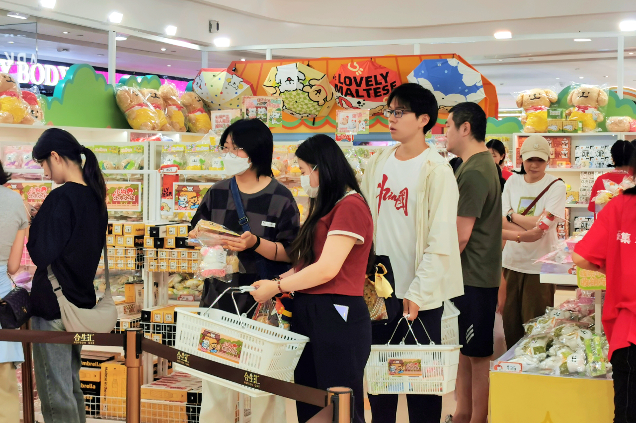 据相关负责人介绍,“线条小狗”因其活泼可爱、温暖治愈的形象,获得了众多粉丝喜爱,此次“小狗的北京之旅”落地朝阳合生汇,带来了结合京城元素的新品,如线下首发的冰糖葫芦小狗挂件等,迅速掀起打卡热潮,7月13日快闪店开业首日客流超15万。