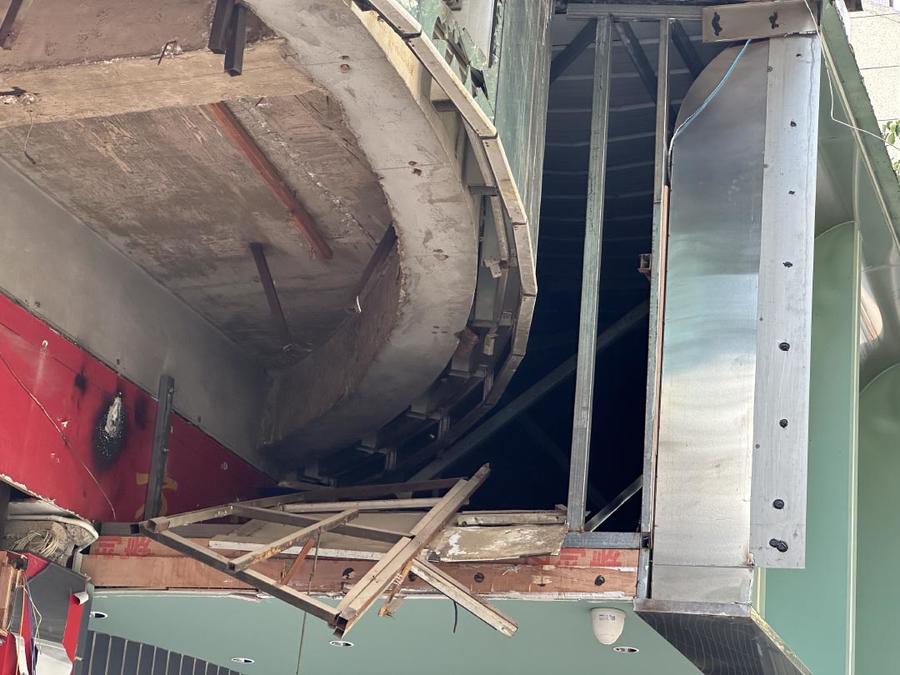 7月23日下午,澎湃新闻记者在事发现场看到,被围挡的7家店铺多是经营水果和餐饮业务。其中,坠落的招牌是5家商铺串联共用。招牌上方的两个大缺口露出了内部框架,一些裸露的板面和管道摇摇欲坠。围挡内的店铺均已停电停业,一些店员忙着向外搬运货物。两名穿着制服的工作人员在现场值守。