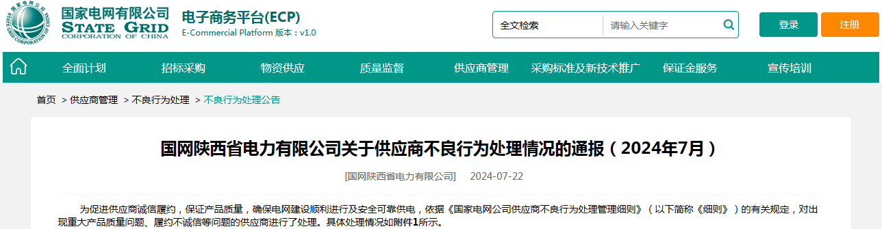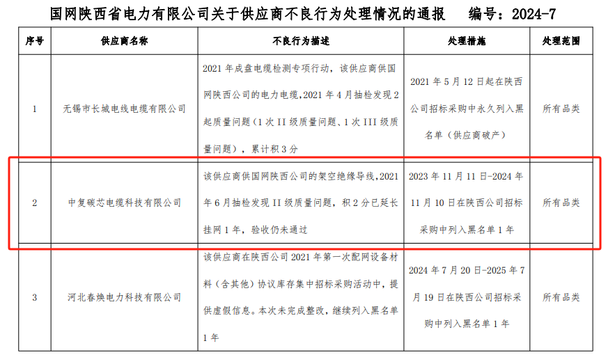7月22日,国网陕西省电力有限公司发布了最新的供应商不良行为处理公告(2024年7月),对出现重大产品质量问题、履约不诚信等问题的供应商进行了处理。其中,中复碳芯电缆科技有限公司(下称“中复碳芯”)上榜。