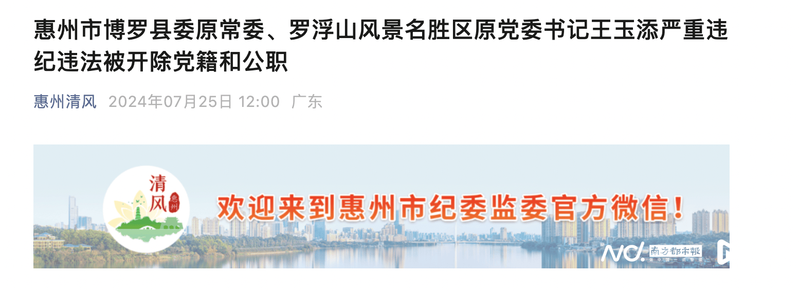 7月25日,惠州纪委监委发布信息,惠州市博罗县委原常委、罗浮山风景名胜区原党委书记王玉添严重违纪违法被开除党籍和公职。