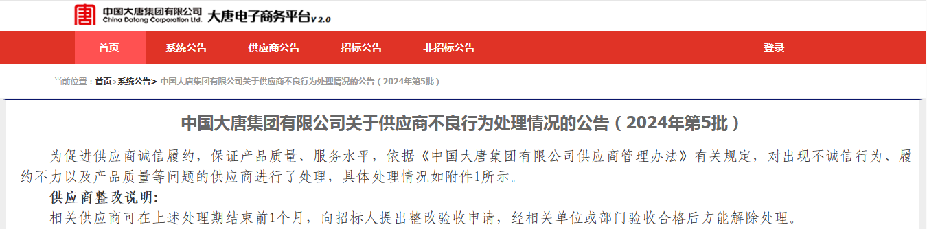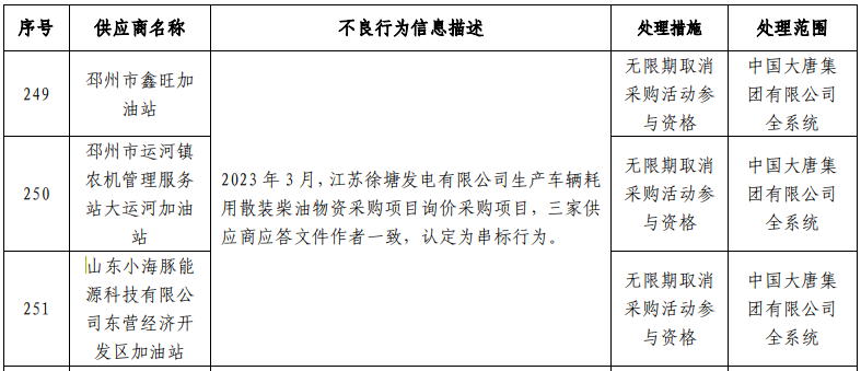 据大唐集团公告的不良行为描述显示,2023 年 3 月,江苏徐塘发电有限公司生产车辆耗用散装柴油物资采购项目询价采购项目,三家供应商应答文件作者一致,认定为串标行为。处理措施均为:无限期取消采购活动参与资格。处理范围均为:中国大唐集团有限公司全系统。