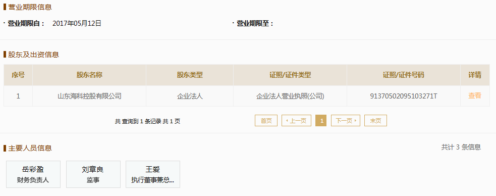 国家企业信用信息公示系统显示,山东小海豚能源科技有限公司成立于2017年,法定代表人为王爱,注册资本6000万元人民币,由山东海科控股有限公司全资控股。山东海科控股有限公司成立于2014年,注册资本25500万元人民币,法定代表人为杨晓宏。