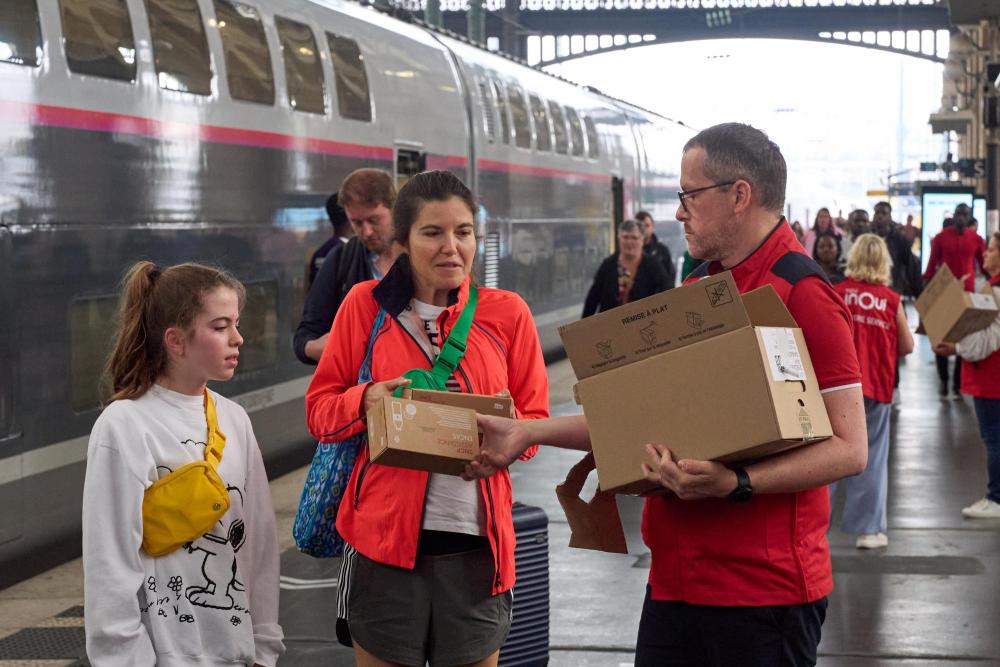 7月26日,工作人员在法国巴黎北站为延误旅客发放食物。新华社发