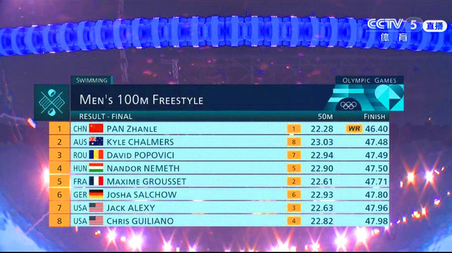 潘展乐游出46秒40,打破世界纪录的同时赢得冠军,这也是中国游泳队本届奥运会的首枚金牌。