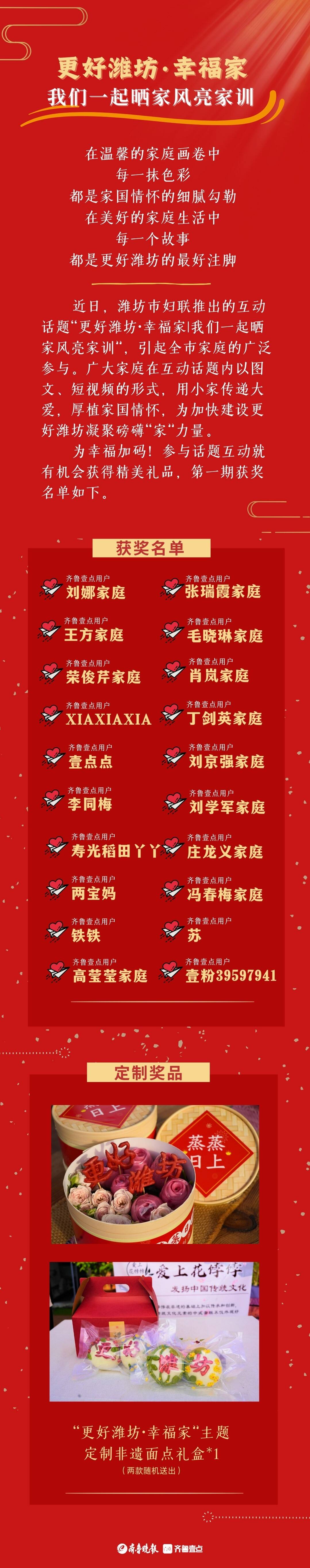 为幸福加码!“更好潍坊·幸福家”互动话题首期获奖名单公布 大众报业·齐鲁壹点 2024-08-04 3590 近日,潍坊市妇联携手齐鲁晚报·齐鲁壹点推出的“更好潍坊·幸福家!我们一起晒家风亮家训“互动话题引起广大家庭的广泛参与。广大家庭在互动话题内以图文、短视频的形式,用小家传递大爱,厚植家国情怀,为加快建设更好潍坊凝聚磅礴“家”力量。 参与话题互动就有机会获得精美礼品,第一期获奖名单如下。 (齐鲁晚报·齐鲁壹点客户端 马小杰) 责任编辑:孙雪婷