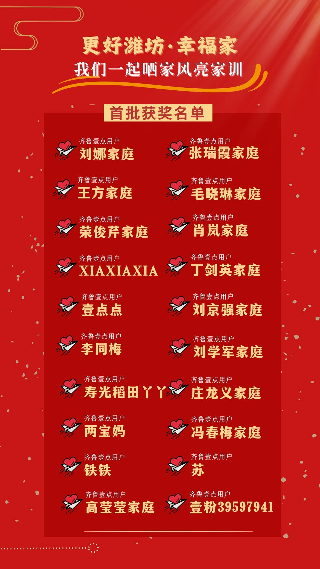 近日,潍坊市妇联携手齐鲁晚报·齐鲁壹点推出的“更好潍坊·幸福家|我们一起晒家风亮家训”互动话题引发了广大家庭的热情参与。广大家庭在互动话题内以图文、短视频等形式,用质朴深情的语言表达了对家庭、对国家真挚的情感,用小家传递大爱,厚植家国情怀,为加快建设更好潍坊凝聚磅礴“家”力量。