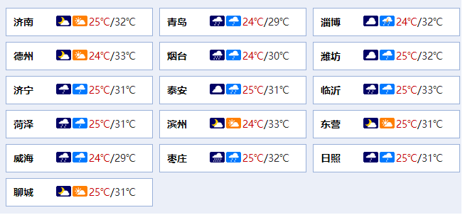 最低气温:鲁西北和鲁中山区23℃左右,其他地区25℃左右。