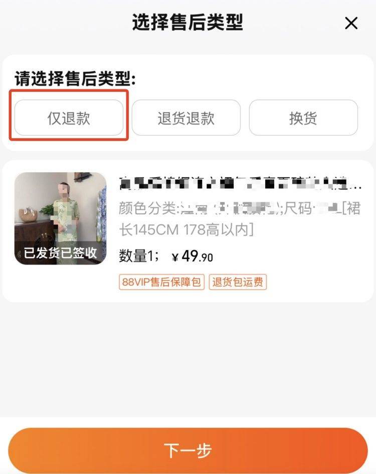 多平台售后中有“仅退款”选项。购物网站截图