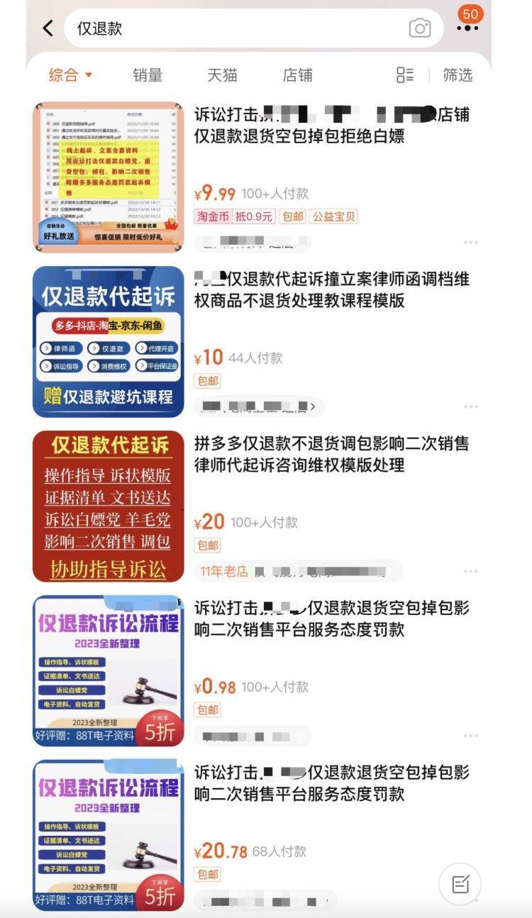 正是基于商家频繁被“仅退款”困扰,在购物平台和社交平台,又出现大量从事商家“仅退款”维权代理诉讼的店铺。客服表示,根据涉事金额进行收费,主要受理范围包括“仅退款”被白嫖、退货空包、掉包,影响二次销售等。“是线上诉讼,咨询的商家很多,只要是符合立案条件,胜诉的几率还是很大的。”客服表示。