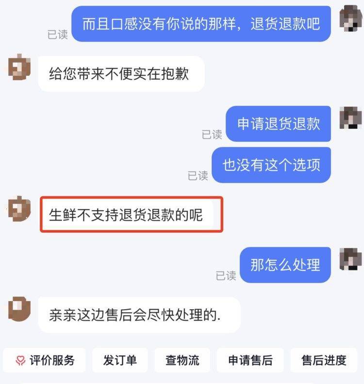 提出退货退款后,商家称生鲜并不支持。购物平台截图