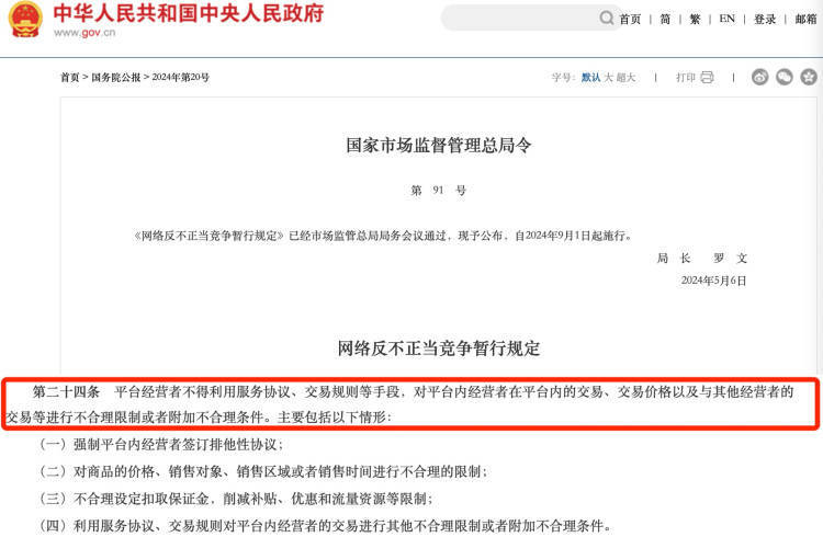 同时,多名相关行业专家也提出,制定完善的规则,才是把握好商家与消费者平衡点的关键。上游新闻记者注意到,9月1日即将实施的《网络反不正当竞争暂行规定》,对于平台的经营行为就做出了明确规定。其中提到,平台经营者不得利用服务协议、交易规则等手段,对平台内经营者在平台内的交易、交易价格以及与其他经营者的交易等进行不合理限制或者附加不合理条件。