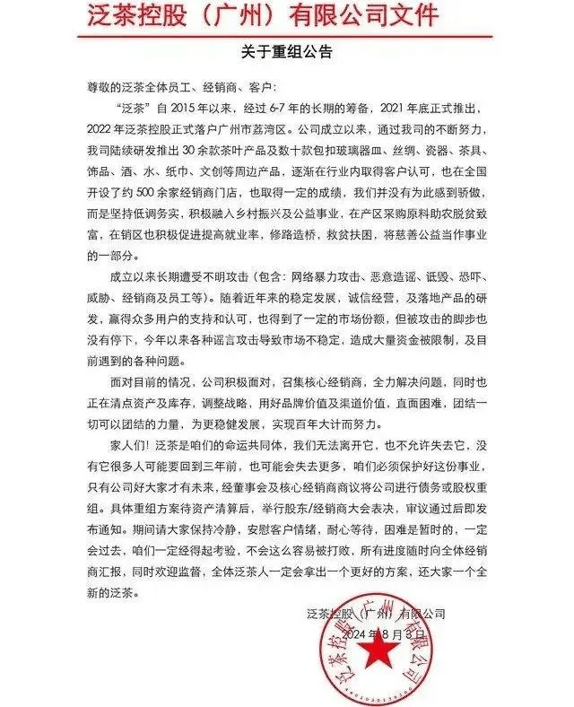 8月3日,泛茶又向经销商发布《关于重组公告》,公告中将其目前面临的问题归结于“谣言攻击”,称泛茶“成立以来长期遭受不明攻击(包含:网络暴力攻击、恶意造谣、诋毁、恐吓、威胁、经销商及员工等)。随着近年来的稳定发展,诚信经营,及落地产品的研发,赢得众多用户的支持和认可,也得到了一定的市场份额,但被攻击的脚步也没有停下,今年以来各种谣言攻击导致市场不稳定,造成大量资金被限制,及目前遇到的各种问题。”