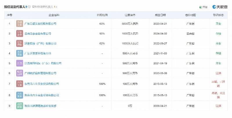 值得关注的是,公开资料表明,郑朝根为80后,名下共关联9家企业,其中5家为存续状态,除上述3家外,还包括去年4月成立的广东泛福实业控股有限公司、今年4月成立的云南泛茶茶业有限公司。
