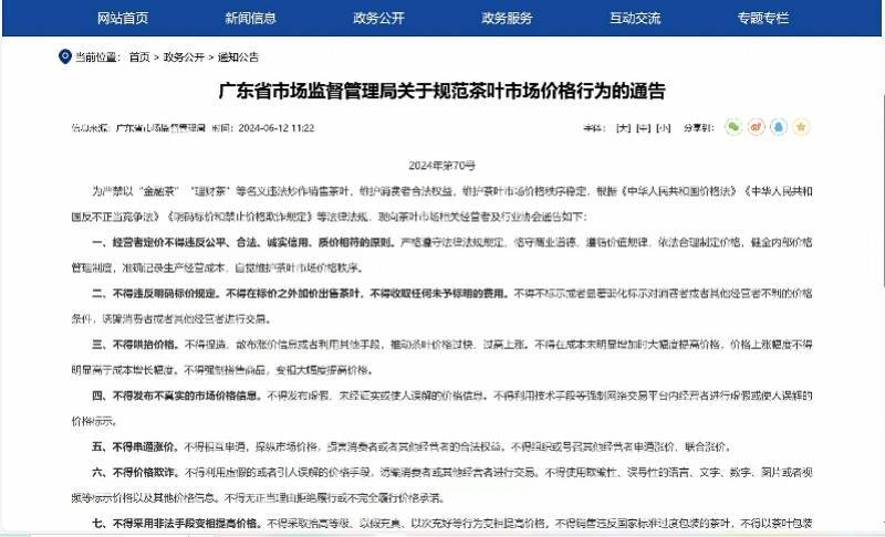 针对违法炒作“金融茶”等现象,今年6月,广东省市场监督管理局发布了关于规范茶叶市场价格行为的通告,表示为严禁以“金融茶”“理财茶”等名义违法炒作销售茶叶,维护消费者合法权益,维护茶叶市场价格秩序稳定,向茶叶市场相关经营者及行业协会提出九方面的要求。