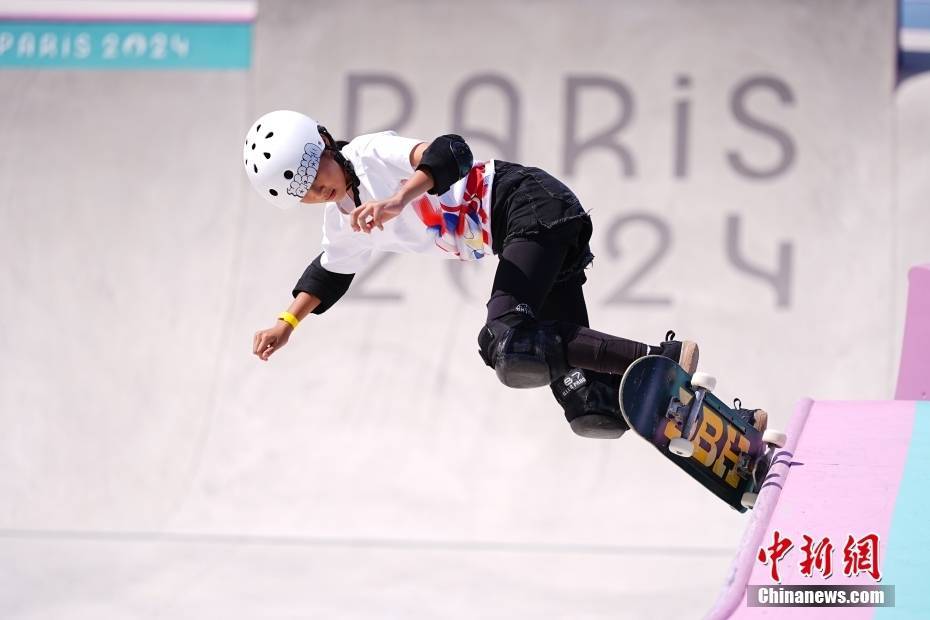当地时间8月6日,在巴黎奥运会滑板女子碗池预赛比赛中,中国体育代表团最年轻运动员、11岁的郑好好亮相。中新社记者 赵文宇 摄