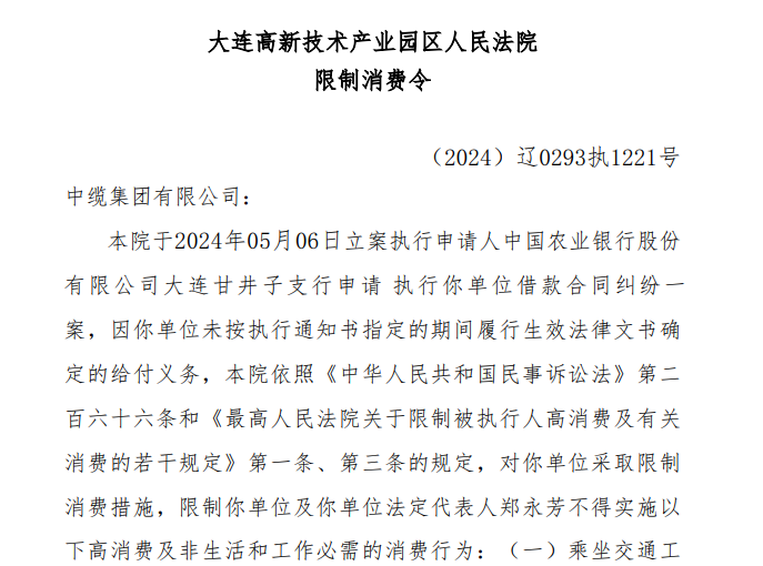 此外,中缆集团曾多次收到法院限制消费令。最近一次是在8月1日,该单位及其法定代表人郑永芳被限制高消费,案号(2024)辽0293执1221号。中缆集团另外两位股东南存孝、郑非凡亦在同日收到大连高新技术产业园区人民法院的限制消费令。