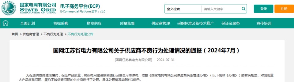 7月31日,国网江苏省电力有限公司发布了最新的供应商不良行为处理公告(2024年7月),对出现重大产品质量问题、履约不诚信等问题的供应商进行了处理。其中,中缆集团有限公司(下称“中缆集团”)上榜。