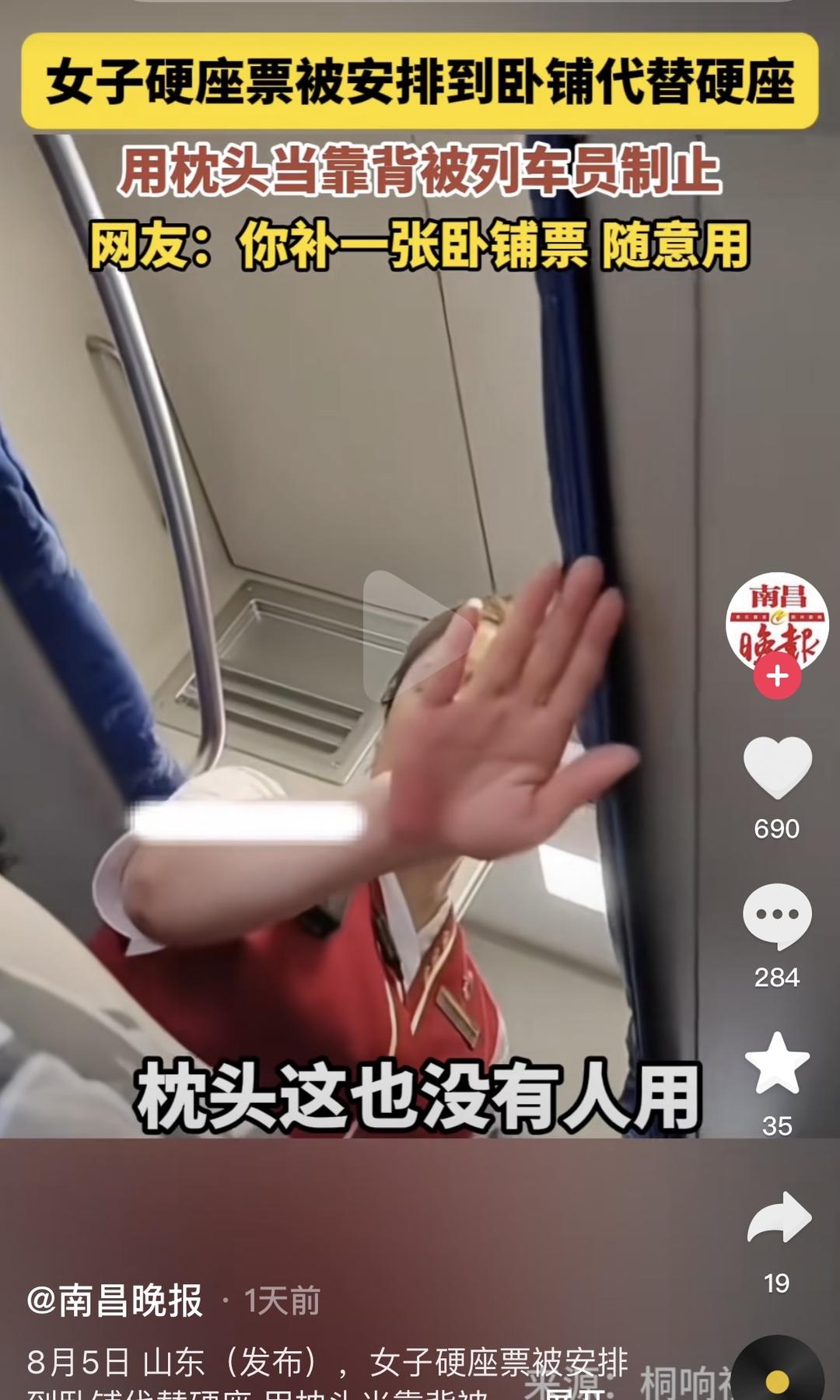 红星新闻8月7日消息,8月5日,一则网传视频显示,一女子买硬座票后,被安排到硬卧代替硬座,其想用卧铺的枕头当靠背时被列车员制止。“枕头这也没有人用,为什么不能用呢?”该女子表示不解,并要求换座。