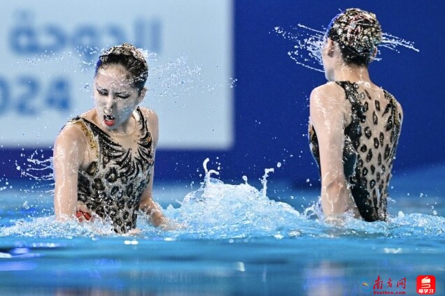 王柳懿和王芊懿在多哈世锦赛双人项目比赛中。图源新华社