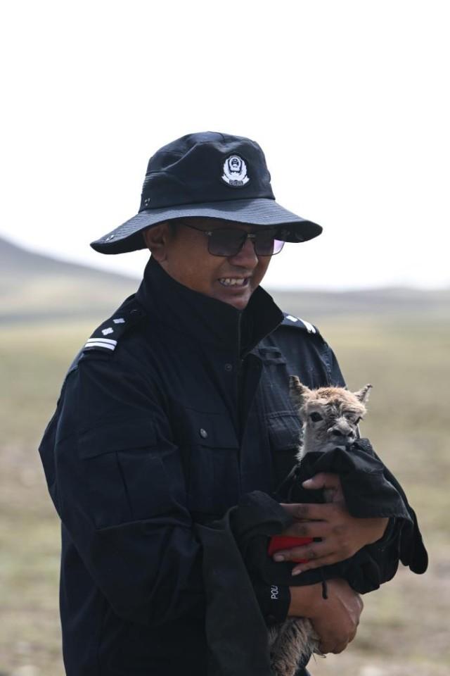 这时,可可西里森林公安局辅警尼玛扎西接过了多结仁欠怀里的小藏羚羊。小藏羚羊浑身湿漉漉的,不停地发抖。尼玛扎西随即脱下自己的衣服,一边给小藏羚羊擦身体,一边温柔地说:“你的妈妈找不到了,我们来当你的妈妈。”