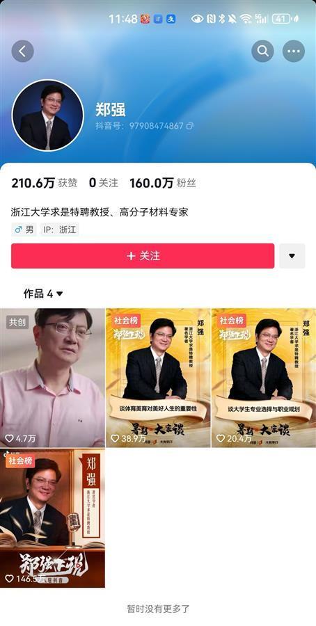 极目新闻记者注意到,郑强个人账号的认证信息为“浙江大学求是特聘教授、高分子材料专家”。12日上午8时许连发3条视频,第一条是上述开通抖音社交账号的短视频说明。