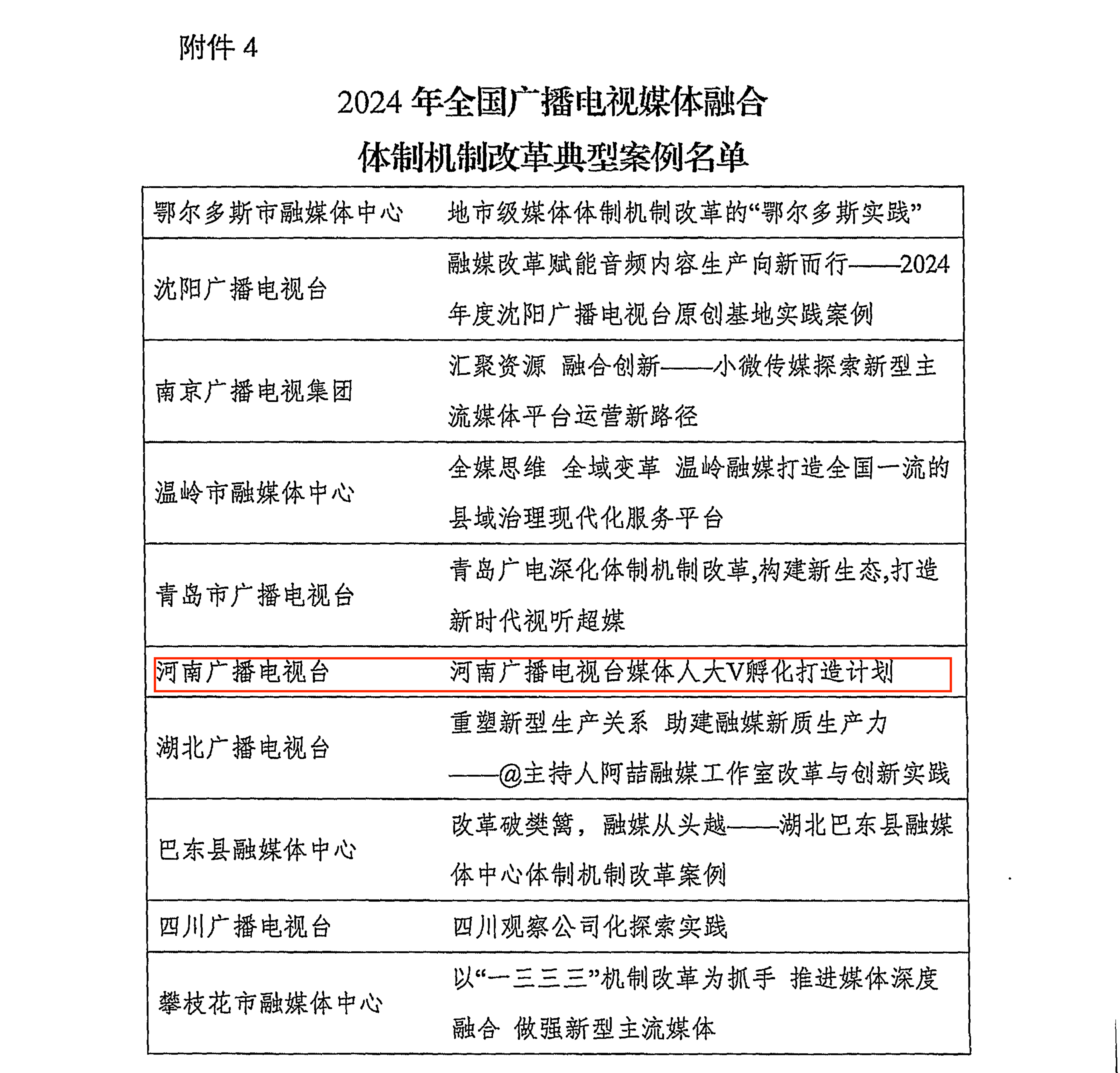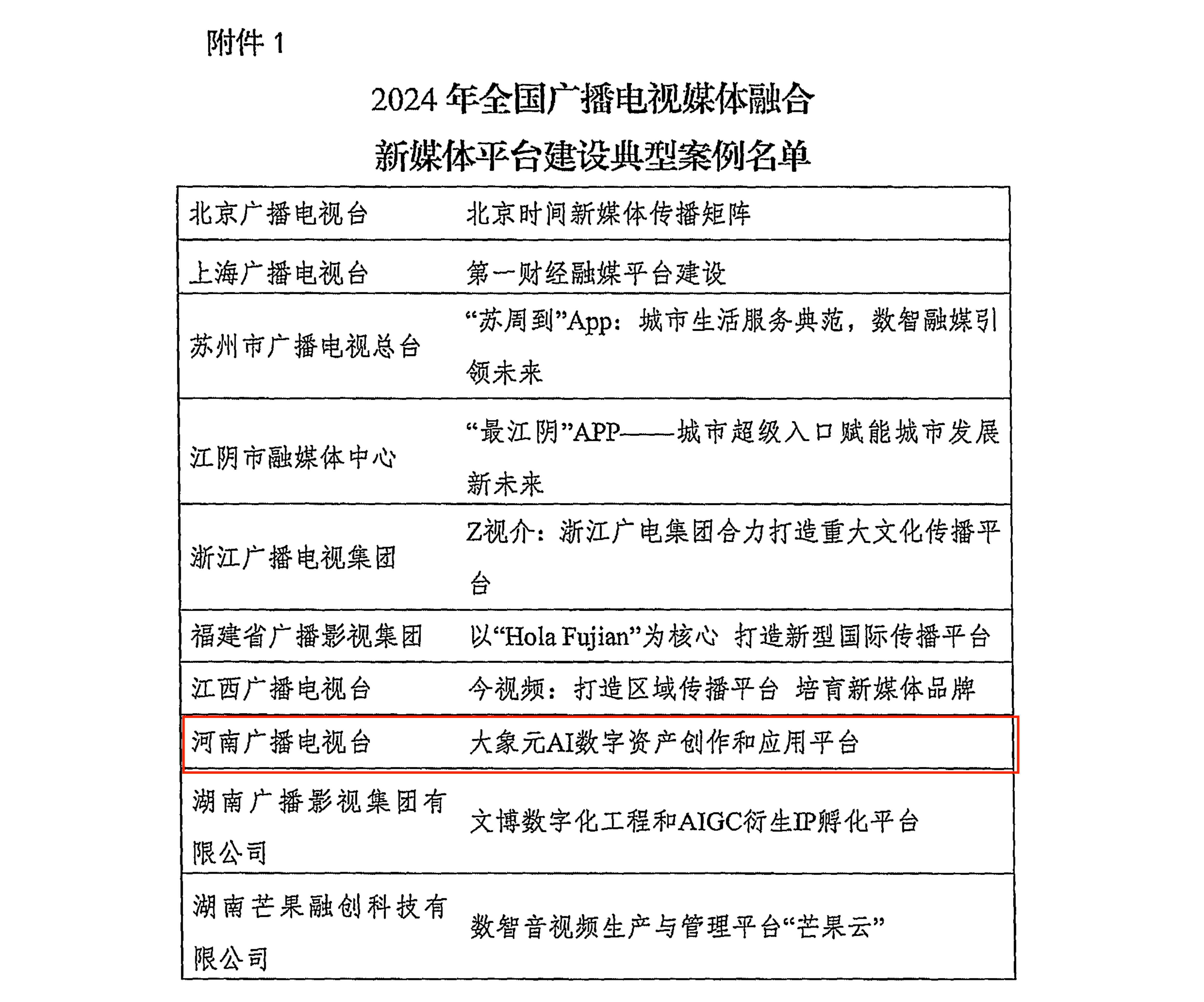 近日,国家广电总局公布全国广播电视媒体融合典型案例,共推选出全国广播电视媒体融合新媒体平台建设典型案例10个、融合生产传播典型案例10个、综合信息服务典型案例10个、体制机制改革典型案例10个。其中河南广播电视台《大象元AI数字资产创作和应用平台》入选2024年全国广播电视媒体融合新媒体平台建设典型案例名单,《河南广播电视台媒体人大V孵化打造计划》入选2024年全国广播电视媒体融合体制机制改革典型案例名单。